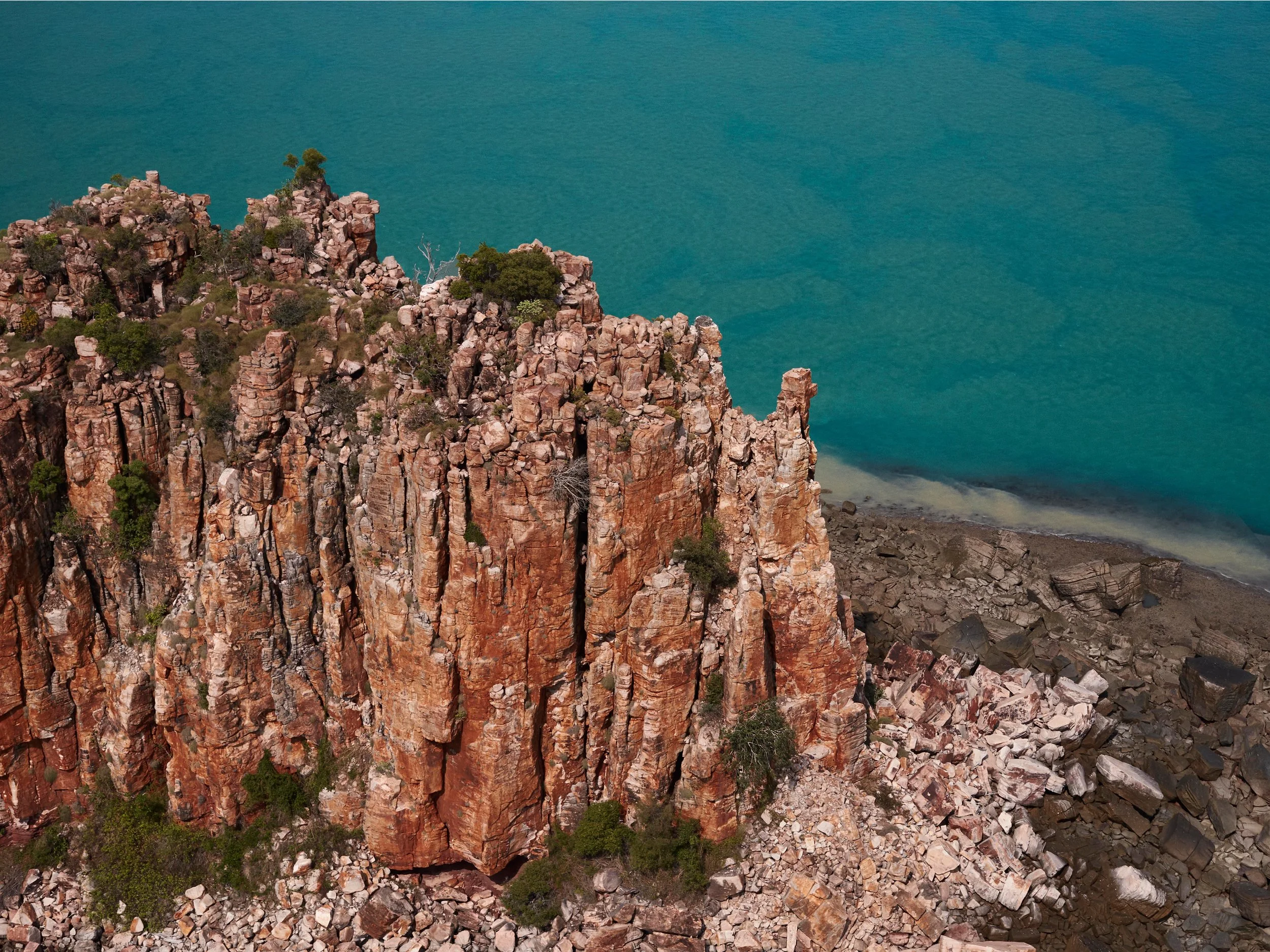 “Flying over these prehistoric landscapes of the southern Kimberley I was enthralled by the absolute inhospitality of this rock form. It defies anyone to land on it by air or sea. Beautiful and hostile” – RUSSELL JAMES